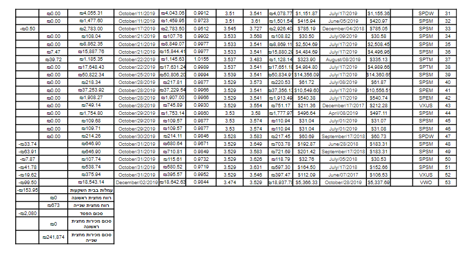 ניתן לראות שלמרות שהיה רווח של כ-$40 בשקלים החישוב הוביל לרווח של 33.99 ש"ח בלבד (ולא 142 ש"ח למשל אם פשוט היינו מכפילים את שער הדולר ביום הקנייה כפול הרווח בדולרים).